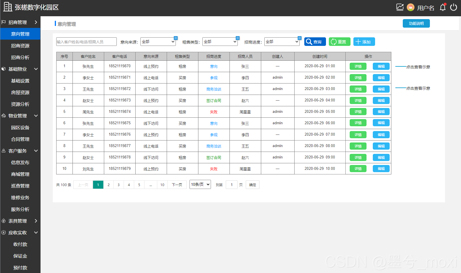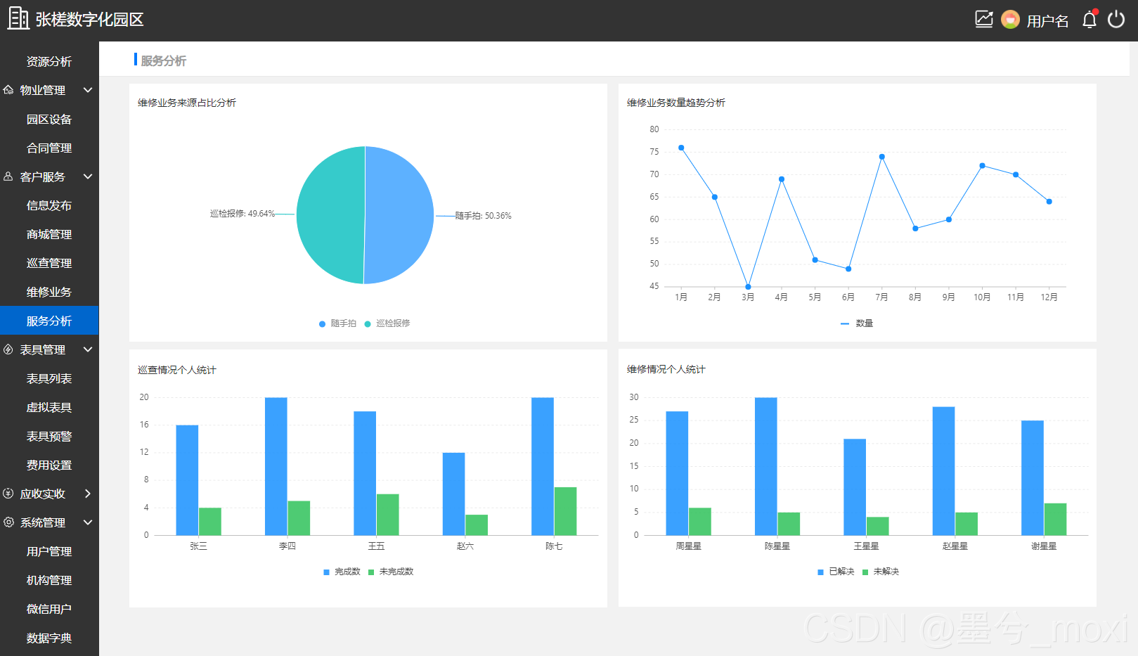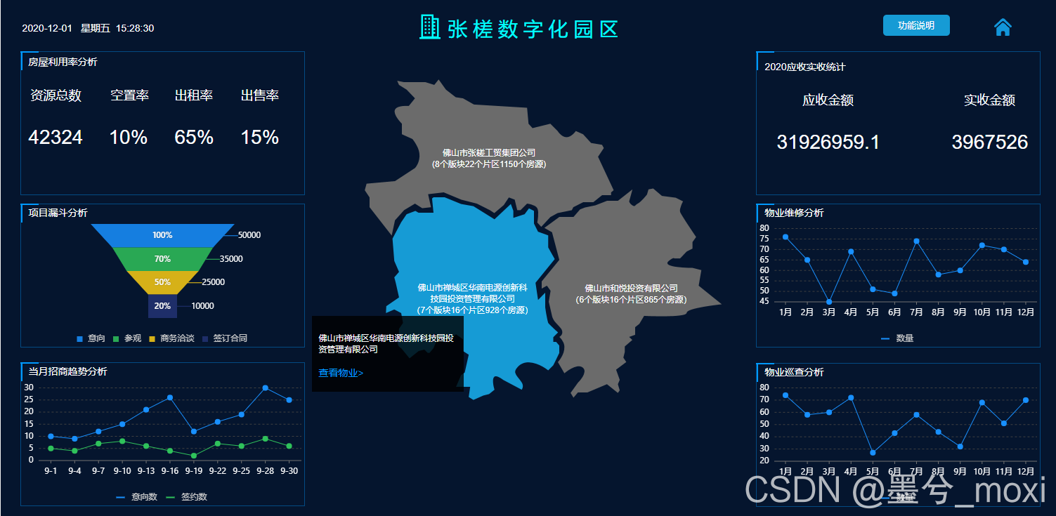 数字化园区、智慧园区、物业管理、园区设备、房屋资源、维修业务、巡查管理、招商管理、商业租售管理,收支管理,合同管理,人员管理,日常维护,巡检管理,报检报修、物业驾驶舱