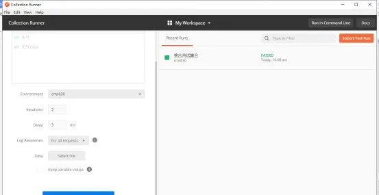 打开“Collection Runner”页,显示是当前集合中的请求数,配置设置环境变量、循环次数、延迟时间、日志和参数。