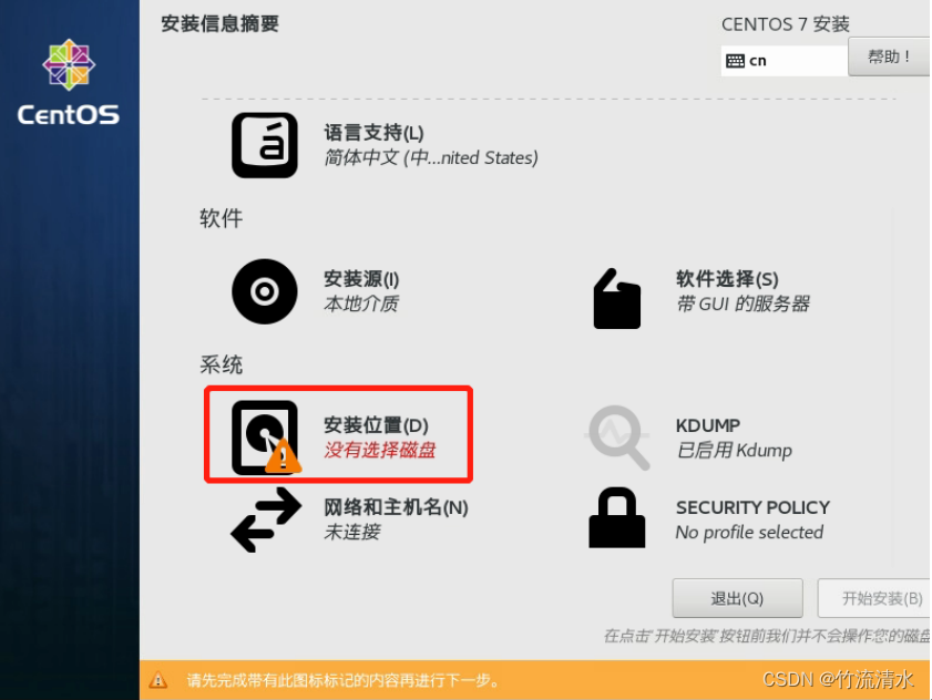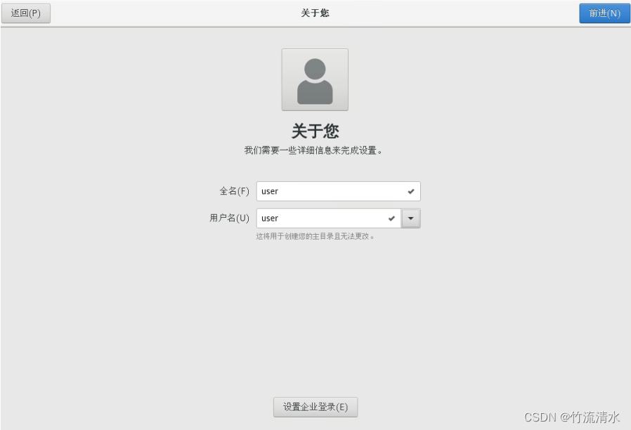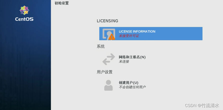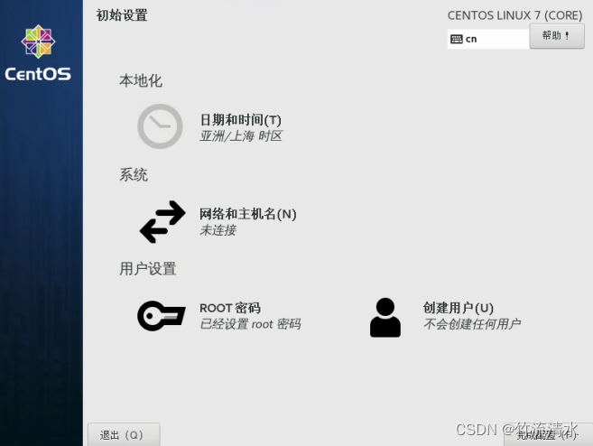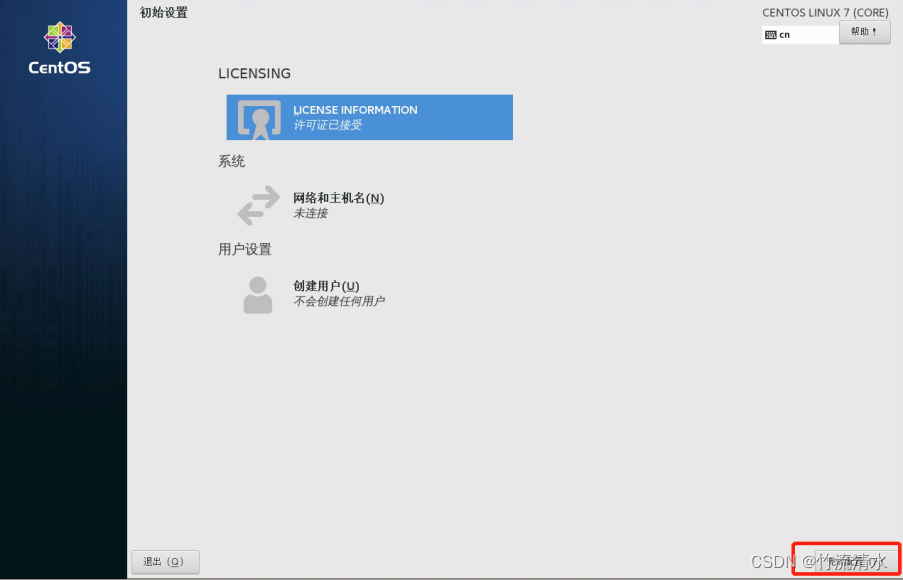 由于安装的是带GUI的服务器,所以首次必须创建一个用户,不能直接用root登录(如果是最小化安装无图形界面则不需要)