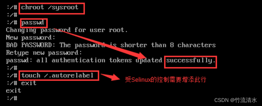 #touch /.autorelabel 用来使selinux的所有的关联标签发生改变,以接受新的ROOT密码
