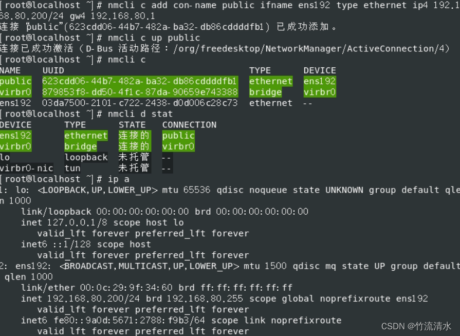 nmcli c add con-name public ifname ens192 type ethernet ip4 192.168.X.X/24 gw4 192.168.X.1