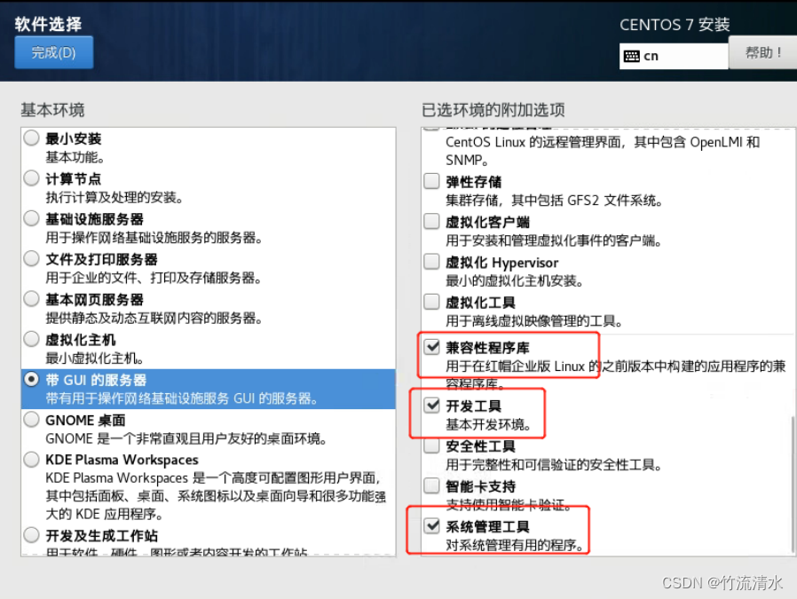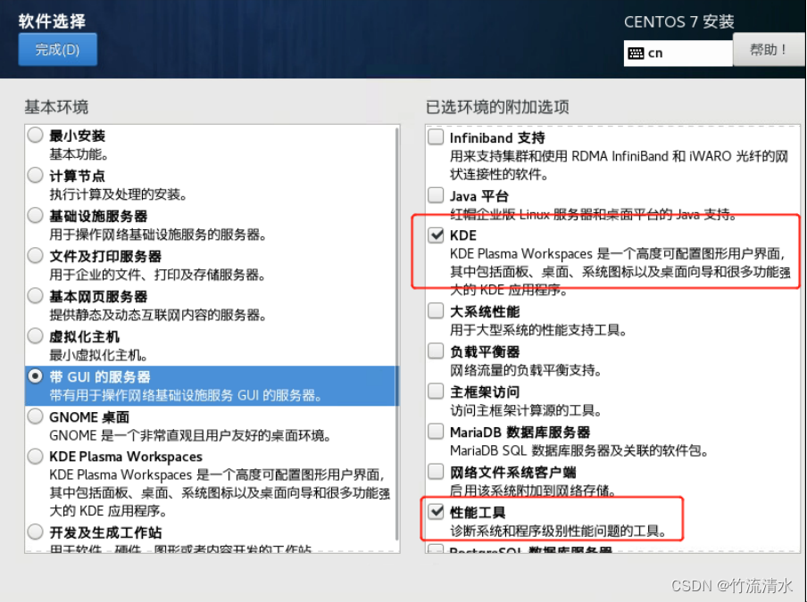 选择“带GUI(图形化界面)的服务器”,选择右边的常规工具:KDE、性能工具、系统工具等。