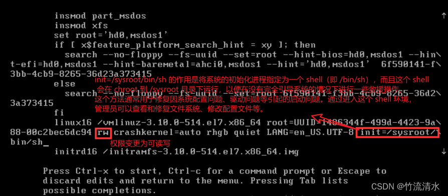 添加init=/sysroot/bin/sh,找到ro将其改为rw