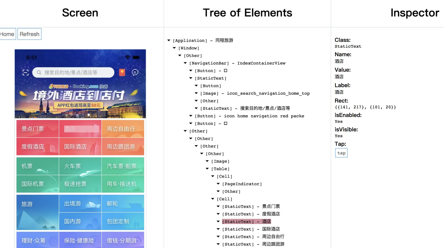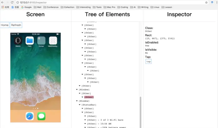 如何模仿用户操作,点击一个按钮呢?还记得之前介绍的 inspector 么?通过访问 http://localhost:8100/inspector 可以获取应用的UI图层结构,方便我们定位控件,写测试脚本模拟用户点击。