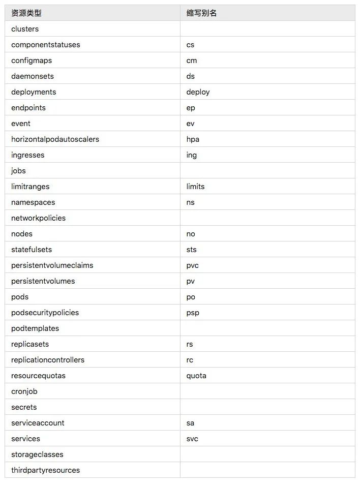 下表列出的是 kubernetes 中所有支持的类型和缩写的别名。