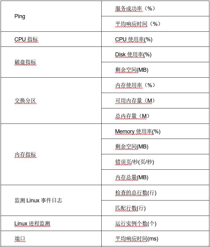 运维监控平台对Linux服务器的监控支持Agent代理、SNMP和SSH、Telnet非代理三大方式,方便不同用户对服务器全面监控的需求。运维监控平台Linux服务器主要监测指标如下