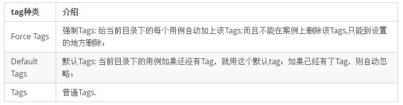 - 可以在各个文件夹下打文件夹名字的tag,这样就可以根据tag单独的跑该文件夹下的用例,查看测试报告也更好看些;