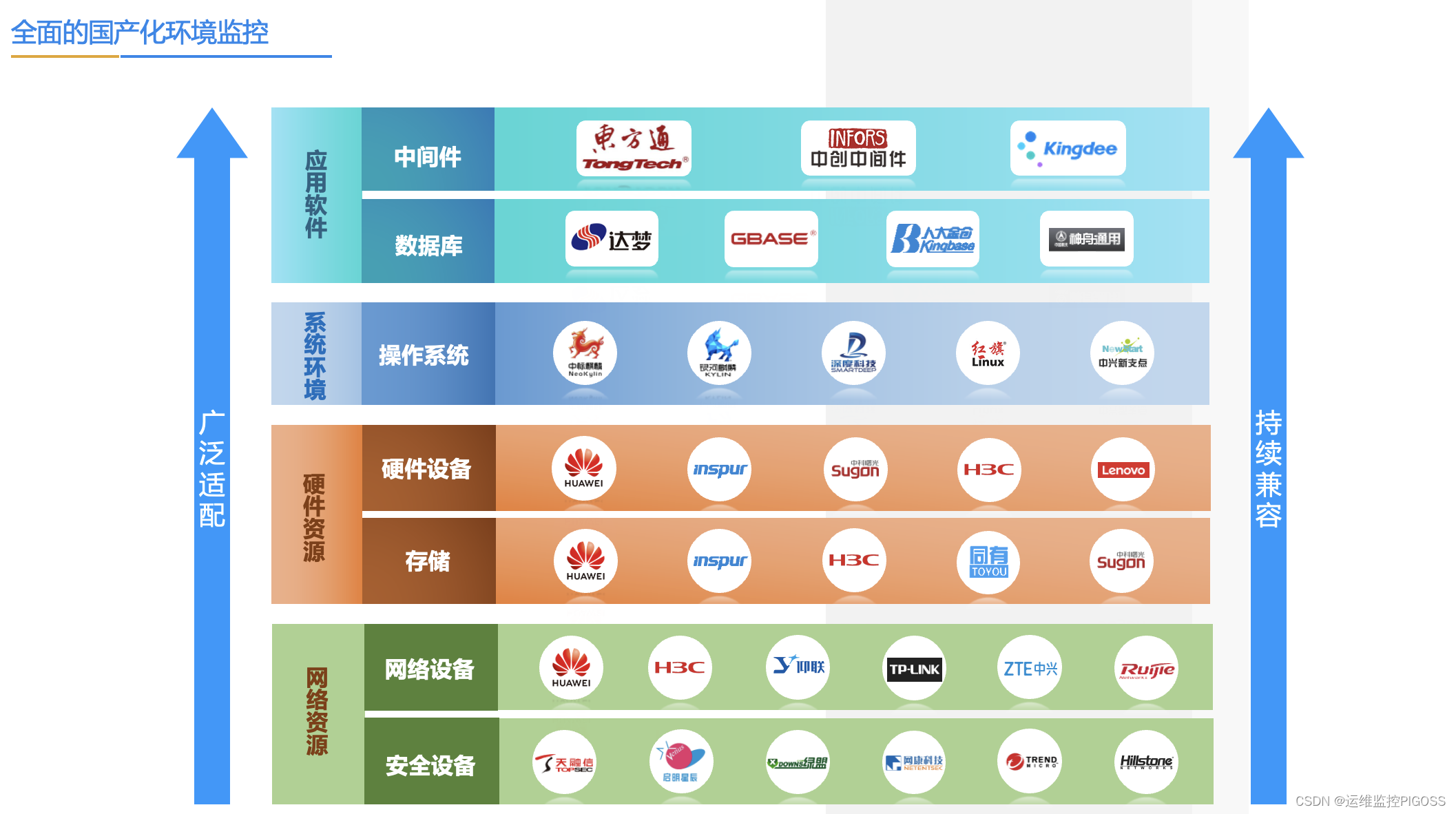 其次,PIGOSS BSM也支持监控主流国产化IT环境,从网络层、硬件层、系统层、应用层已全面兼容。并且兼容的品牌也在持续不断地扩展中。