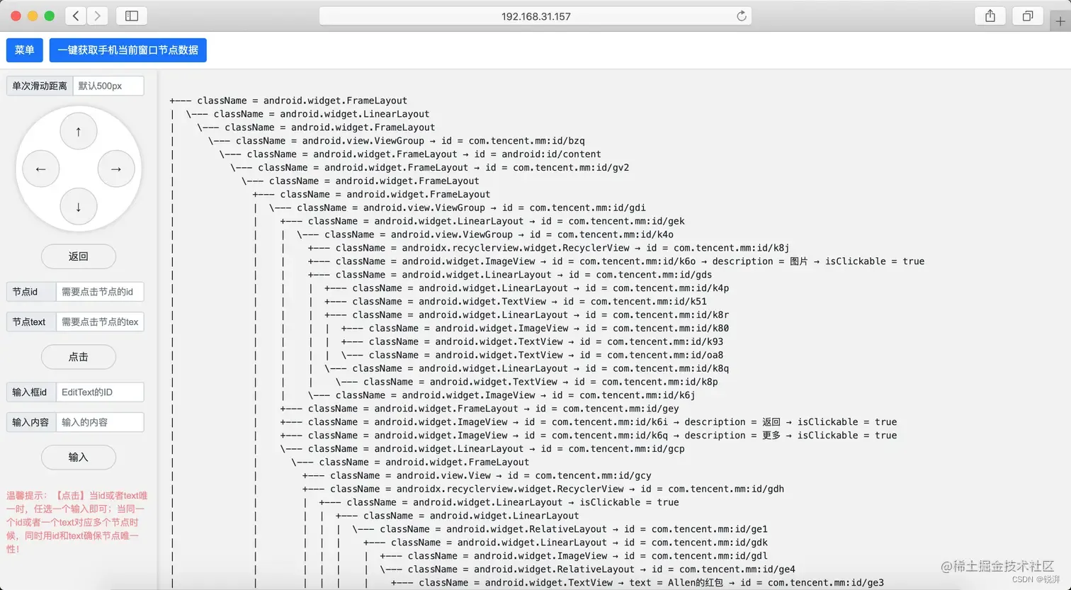 上边介绍了通过悬浮球去打印信息,后来对打印的数据也做了简化处理,但是对使用者来说还是不太方便,弊端有两点,一是需要手机连接到Android Studio上通过查看log的方式查看节点信息,这点在后来的实际场景中感觉很鸡肋,二是即使后来我也加了在手机端直接查看的功能,但移动端终究是小屏,看起来很费劲,而且没法搜索查找。基于以上两点,连夜重构了这部分代码,让我们的数据可以在电脑端浏览器里直接操作查看。