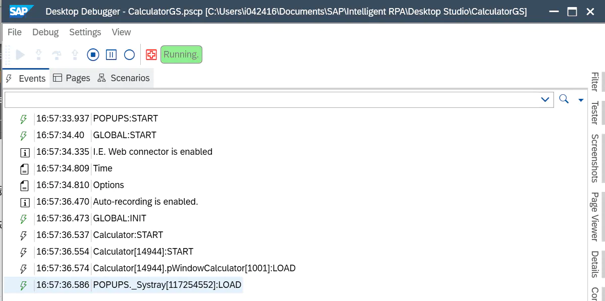从上图看出,SAP iRPA自动生成的JavaScript脚本可以单步调试。点击Debug按钮,弹出了SAP iRPA调试器。