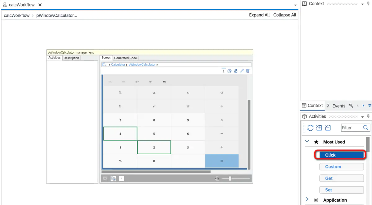 在Activities面板里,找到Click这个动作,将其依次拖拽到屏幕正中的4,+,2和=这几个按钮上。