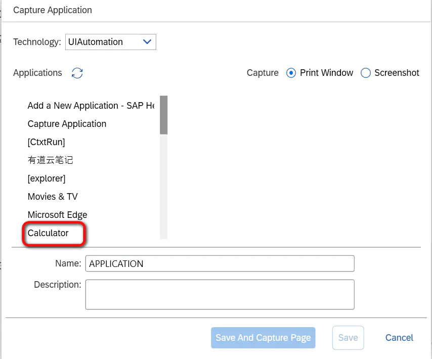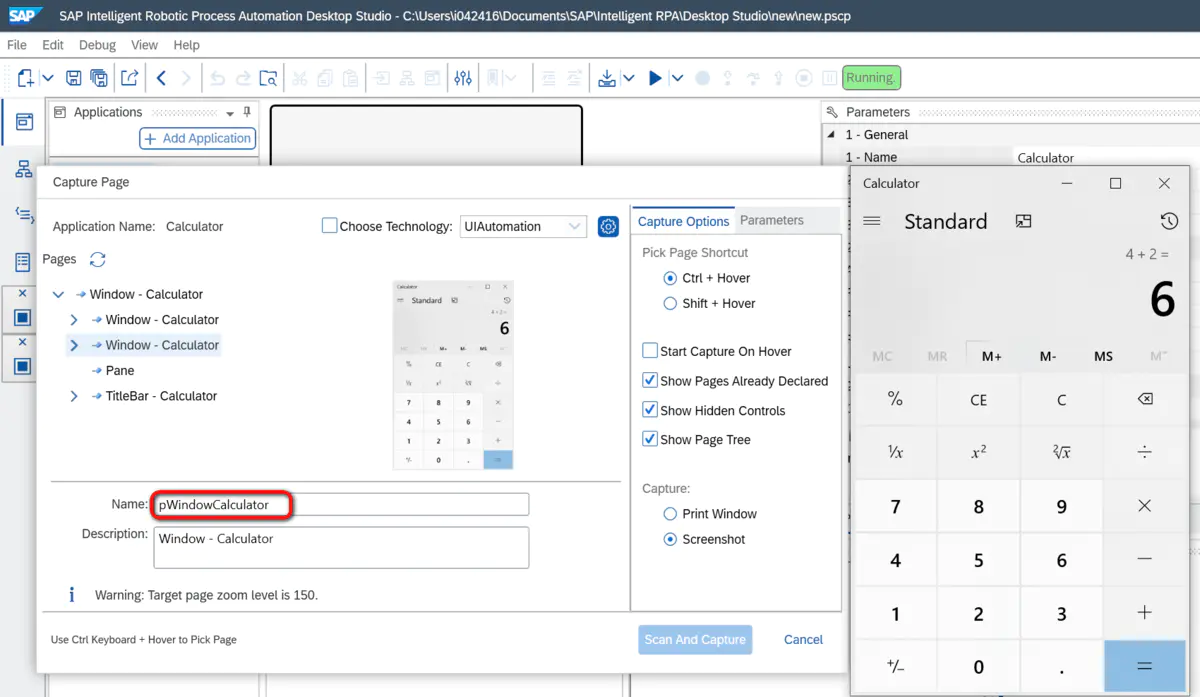 按住Ctrl键不放,把鼠标放到计算器应用上,SAP iRPA会智能的识别出这个计算器应用窗口的句柄:pWindowCalculator, 此时点击Scan And Capture: