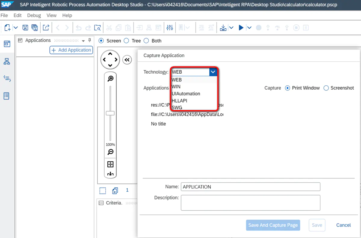 在进程列表里选中Calculator,右边的预览窗口立即能看到其界面。点击Save and Capture Page,这样SAP iPRA就同计算器应用建立起连接了。