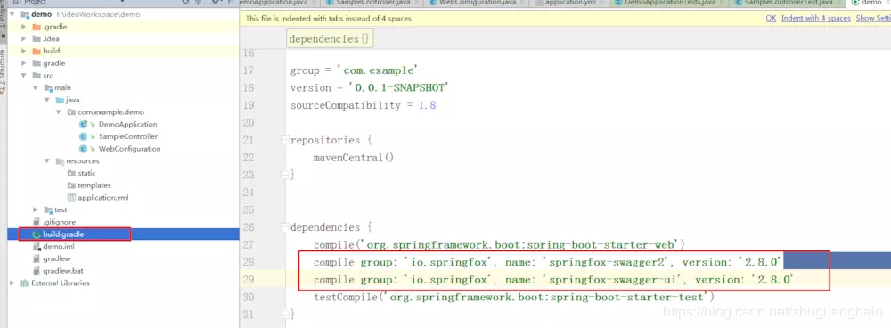 1.build.gradle增加swagger相关jar包,maven项目同理。