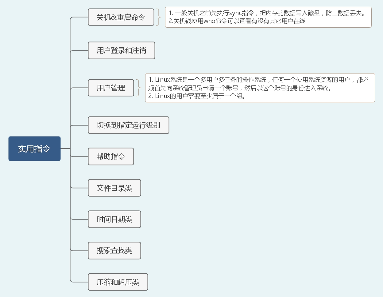 主要阐述了一系列实用指令,包括:关机&重启命令;用户登录和注销;用户管理;切换到指定运行级别;帮助指令;文件目录类;时间日期类;搜索查找类;压缩和解压类。