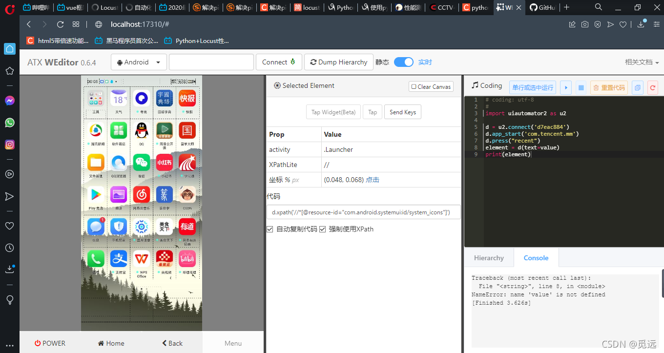 界面元素查找工具(python-App自动化数据配置及运行中有两种方法:Android Sdk包中的 uiautomateviewer 和 Appium Desktop 中的 Appium Inspector),前面这两种方法都需要链接数据线,但是在uiautomator2可以在同一局域网下无线操作,所以使用新的工具而不需要连接数据线更加方便。 uiautomator2提供了weditor工具来解决这个问题。