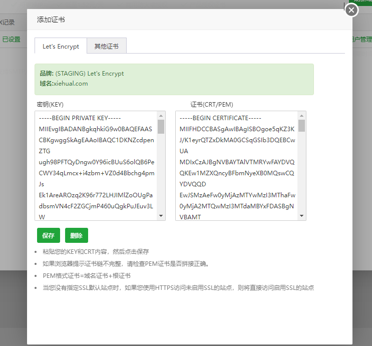 5.2 其他证书部署,证书所属域名必须是你邮箱域名的主域名。将证书key以及pem文件内容填写报错即可