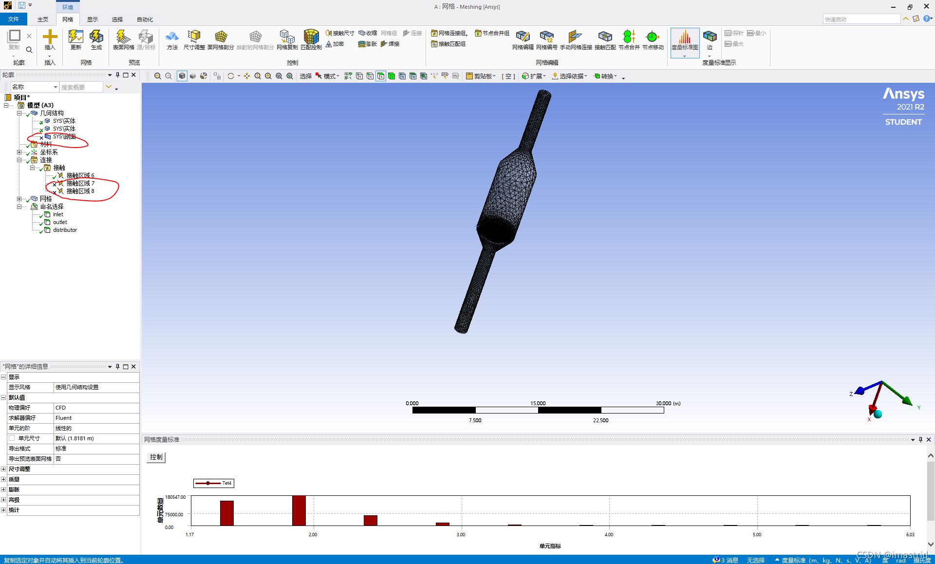 1.打开spaceclaim2.根据尺寸用线画外壳半截面3.然后取消草图,绕轴中心旋转360°4.选择截面继续在对应位置画分布板的线条5.取消草图,绕轴中心旋转360°6.选择相交里面的组合,选择主体,然后选择画好的分布板面。会自动分割实体,获得两个实体7.在分布板上画圈,或者任何分布板的孔形状8.在画网格时,设定好哪里是wall,哪里是outlet......