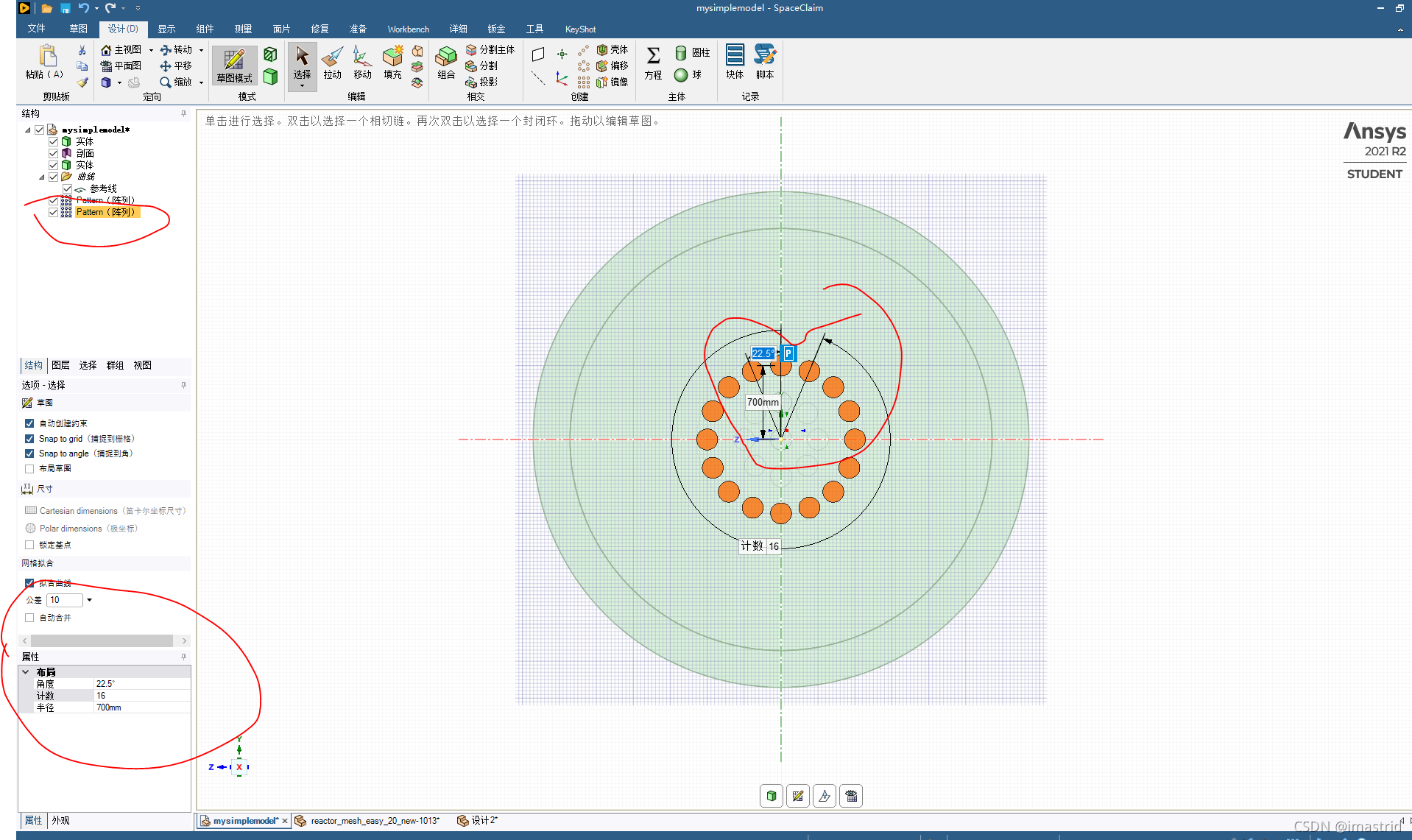 不知道输出到ansys meshing的时候,只有中间画的那个圈扣掉了,其他的都没有,因此,在spaceclaim里面对每个圈我又叠加画多了圈。