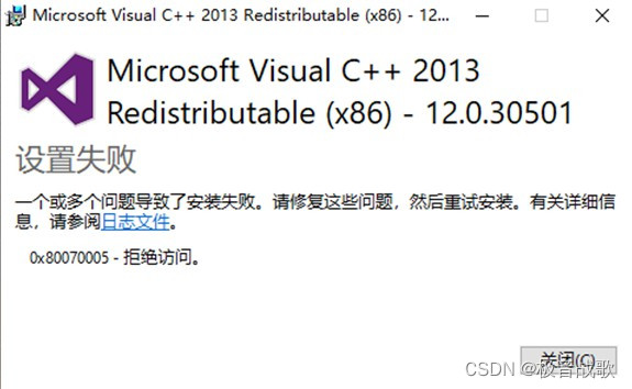 2、提示The Visual C++ Redistributable installer failed with error 5.Unable to continue installation.