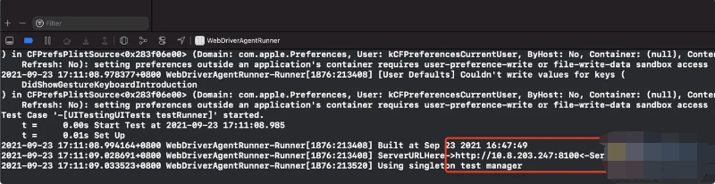 使用Xcode打开WebDriverAgent工程,配置好证书之后,点击Xcode的Product->Test,然后就会运行到手机上, 控制台会输出手机的服务端口号: