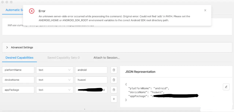 在启动Xcode项目WebDriverAgent之后,并且安装到真机之后,打开Appium,启动服务,来到这个页面,输入下面的的能力字段,应该是就可以连接到真机了。
