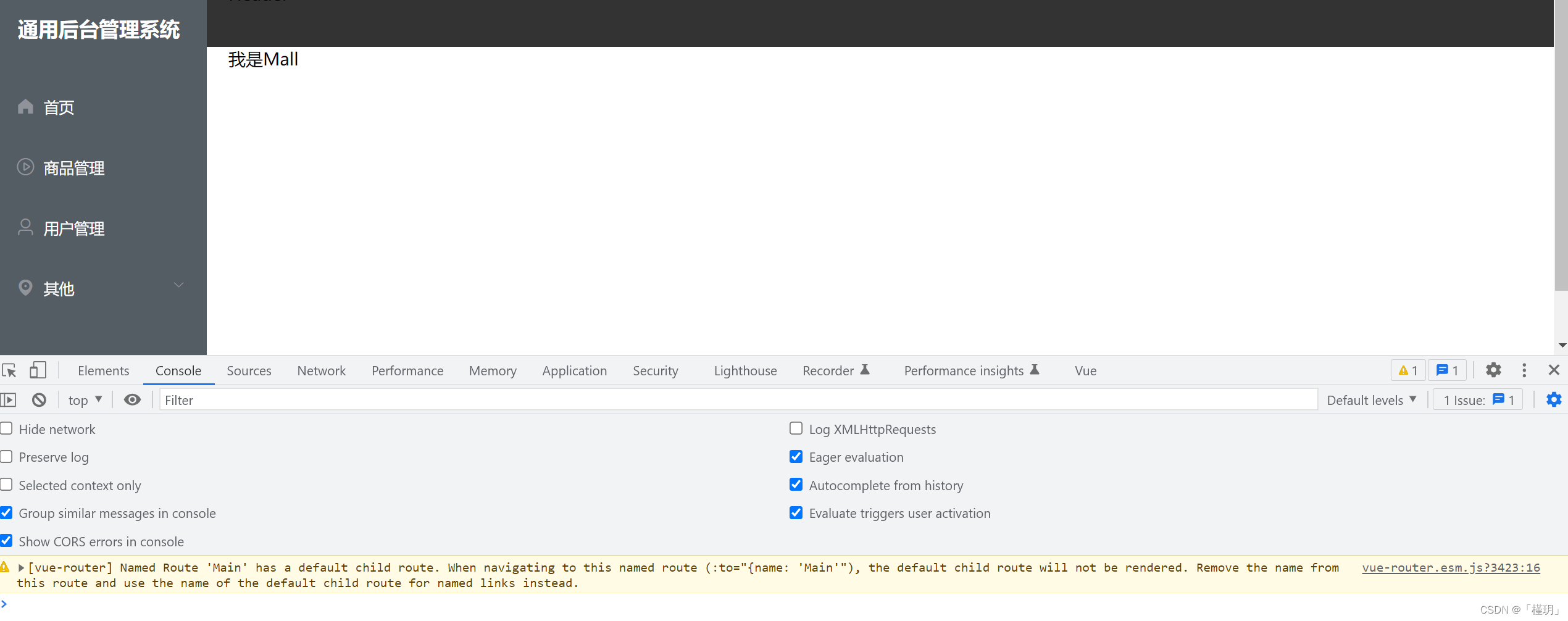 原因:在vue中,如果有默认子路由,在路由配置项中,就不用给父级路由设置name了,否则会有一个警告