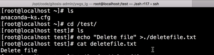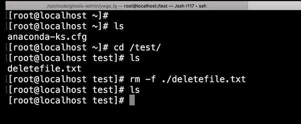 接下来在另一个窗口,我同样到/test 目录下,而此时我要执行的是 rm -rf ./deletefile.txt,这样就“彻底”把这个文件删除。接下来我们通过 ls,可以看到本地已经没有这个文件了。
