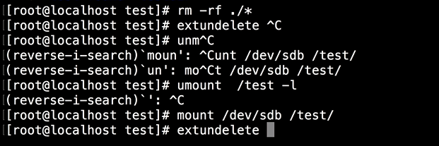 在执行命令extundelete之前需要先做的是 umount,把我们刚刚误删的目录 umount 掉(umount /test -l),避免有新的进程再往磁盘块里写数据,同时也便于执行工具进行接下来的分析。