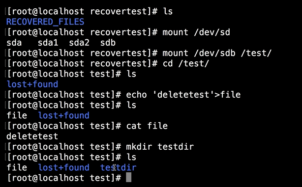这种情况要如何恢复数据呢?我们需要安装 extundelete 这个工具。登录到我的测试机上,在这个演示场景里,挂载一块独立硬盘设备 /dev/sdb 并作数据格式化。完成格式化后。把单独的 sdb 设备,挂载到 test 目录下(mount /dev/sdb /test),接下来在 test 目录下生成一个内容为“deletetest ”的测试文件file(echo 'deletetest'>file),这个时候本地目录会生成一个测试的文件:file,再新建一个叫 testdir 的目录(mkdir /test/testdir),那么这时本地既有文件又有目录,也就是我接下来要演示删除的这些文件。