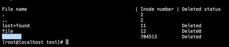 我们可以在命令后面加入设备名称,然后加入上面的 inode 进行分析。完成之后我们会看到显示屏幕上已经出现了刚刚删除的文件、名称及目录,还会看到 inode 号以及当前的状态。
