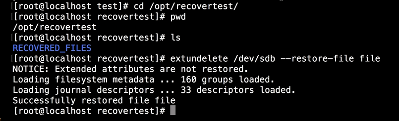 在执行以上恢复操作之前,我先要确保数据恢复的目录 /opt/recovertest 下,cd /opt/recovertest 目录下,执行想恢复的文件 extundelete /dev/sdb --restore-file file。