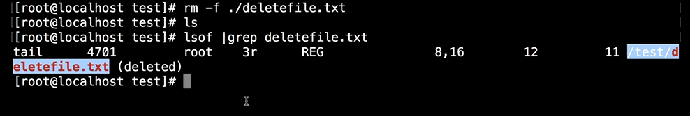 首先需要找到是哪个进程在使用这个文件,我们可以通过 lsof 命令,grep 刚刚删除的文件名称(deltefile.txt),会列出当前使用文件的进程。我们会看到tail 命令正在使用,它(进程)的 pid 是 4701。
