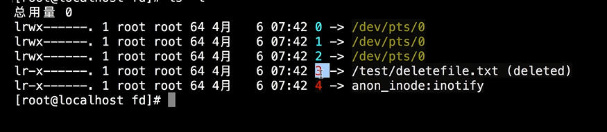 接下来我们要根据这条线索去恢复数据。我们知道该进程会有使用的文件句柄,那么我们对该进程的文件句柄目录进行查找,cd 到 /proc/{pid}/fd 目录下(这里 pid 为4701),我们到这个目录下,输入 ls -l 命令,这个时候我们会看到,使用这个文件(/test/deletefile.txt)并且它的文件句柄为 3。