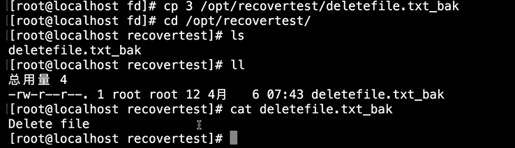 这个时候cd /opt/recovertest/,cat deletefile.txt_bak 看一下里面的内容,可以发现这个文件的内容与刚刚生成的的测试文件内容一致,所以刚刚删除的文件恢复完毕。