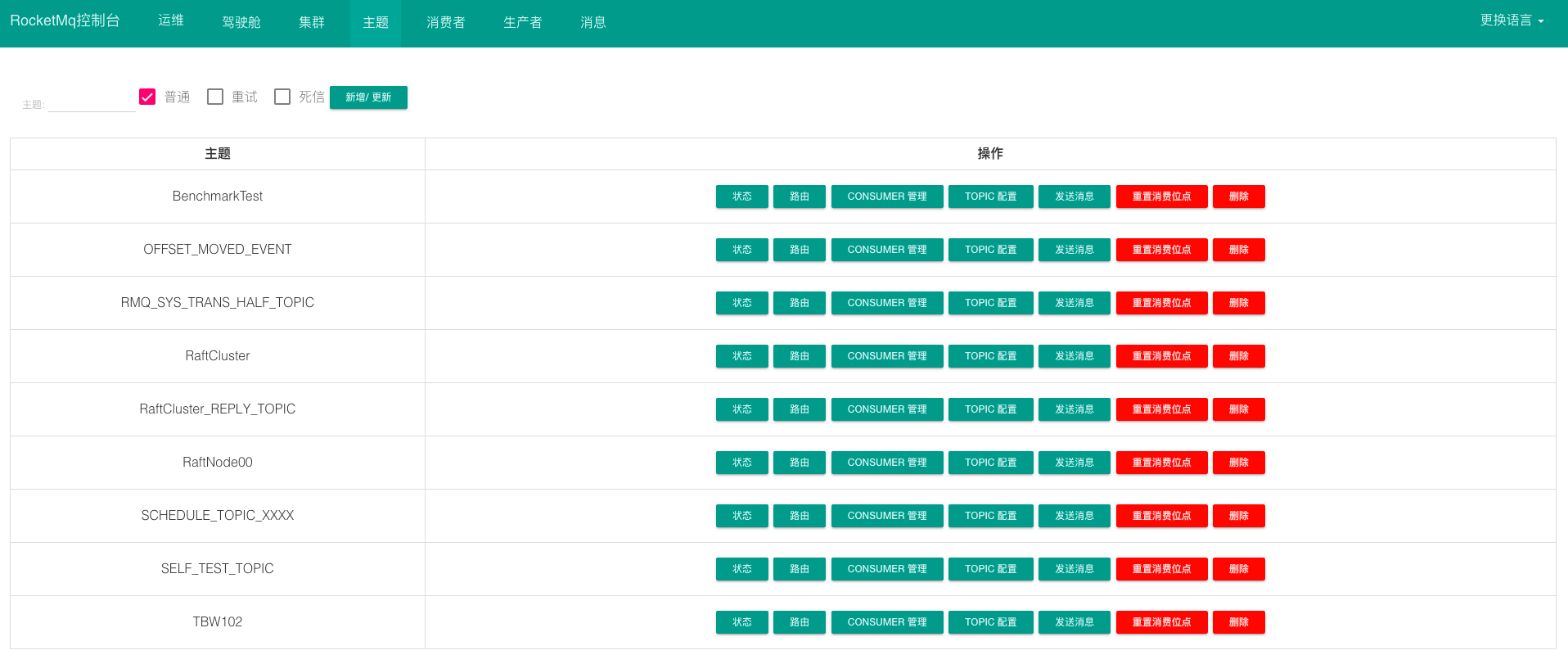 主题:即topic,可以新增/更新topic;也看查看topic的信息,如状态,路由,消费者管理和发送消息等。