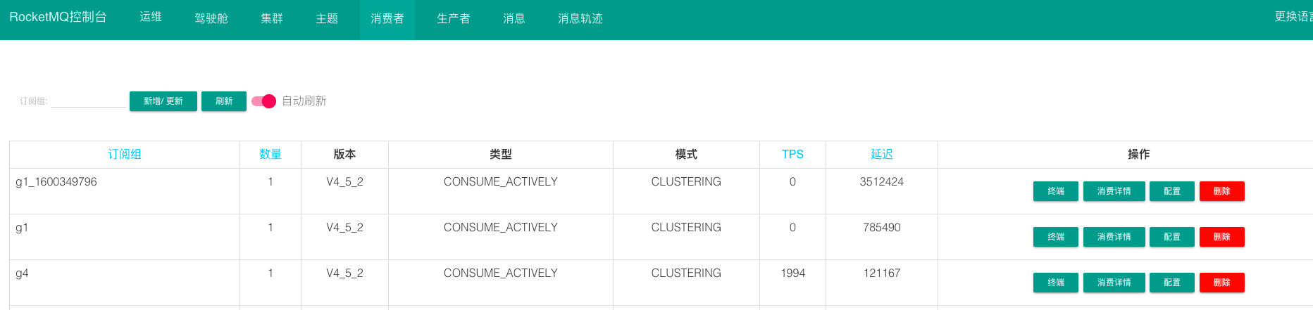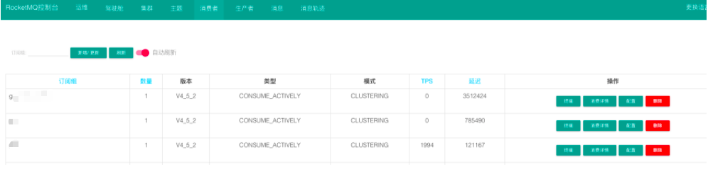默认展示订阅组的名称,对应consumer的数量(多个consumer使用一个group),版本信息,类型,默认,TPS,延时