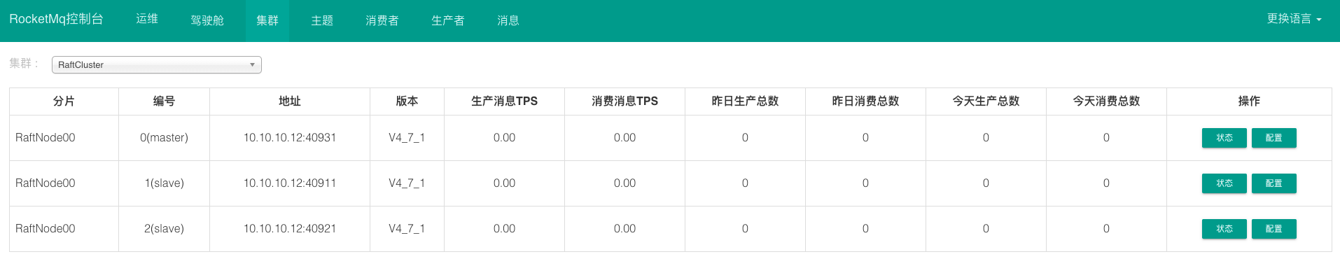 集群:整个RocketMq的集群情况,包括分片,编号,地址,版本,消息生产和消息消费的TPS等,这个在做性能测试的时候可以作为数据指标。