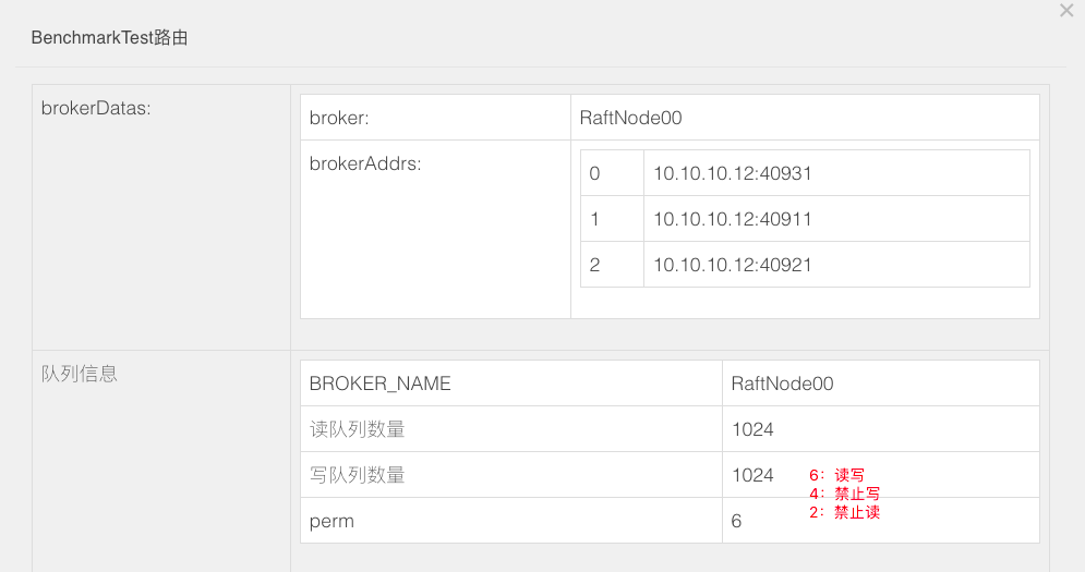 下面比较有用的是perm,通过修改perm可以使当前broker分别置为只读,只写,和读写状态。当用于运维的时候可以将broker置为只读状态。