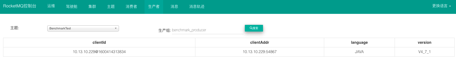 如图,我用rocketmq自带的Producer压测工具进行压测,可以看到客户端的ip,并且其语言为java,版本为4.7.1。