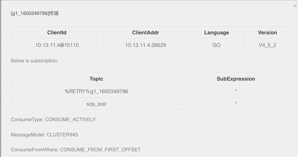 里面描述了consumer的详细信息,ClientAddr指明了客户端的地址,Language说明使用的是GO语言,版本为4.5.2