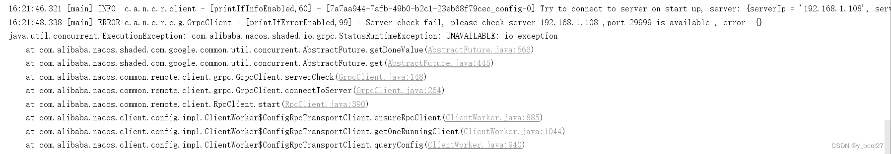 16:21:48.338 [main] ERROR c.a.n.c.r.c.g.GrpcClient - [printIfErrorEnabled,99] - Server check fail, please check server 192.168.1.108 ,port 29999 is available , error ={}