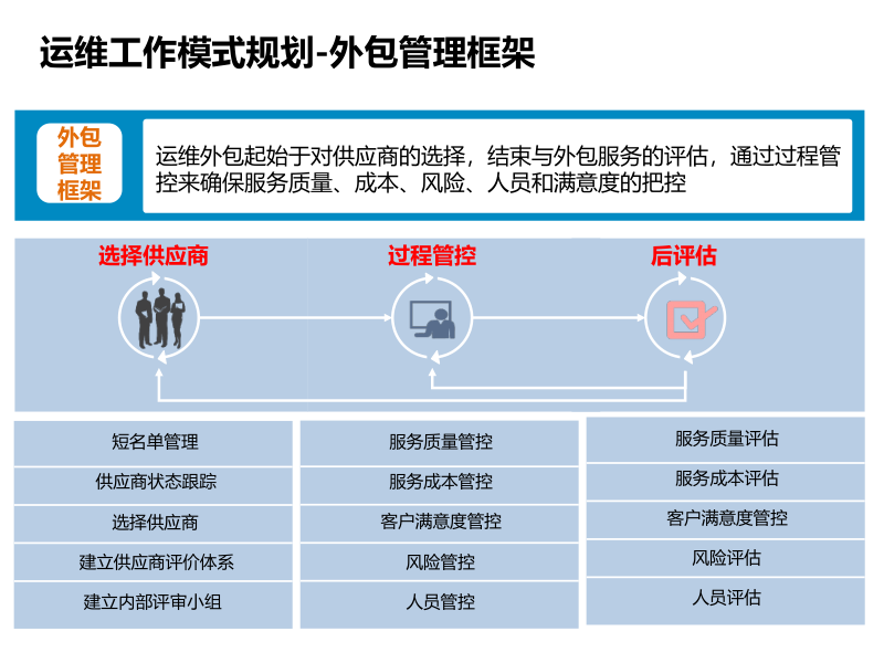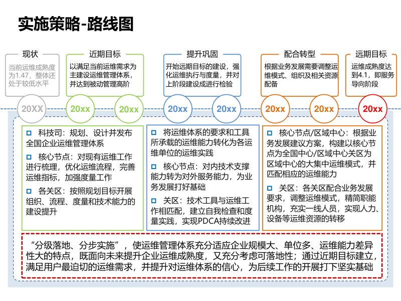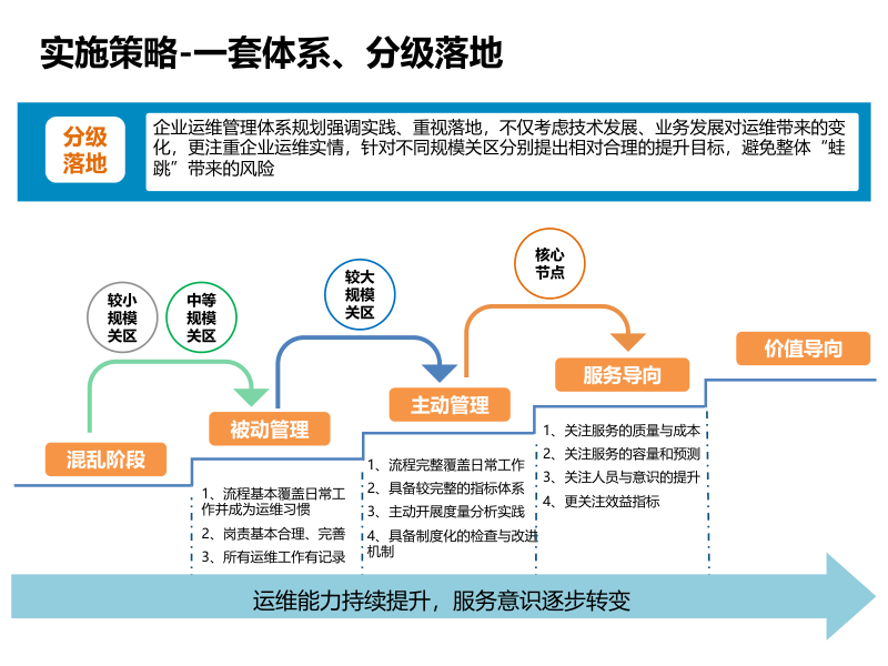 分阶段完善:优先建立服务目录、可用性管理、容灾规范等核心流程。