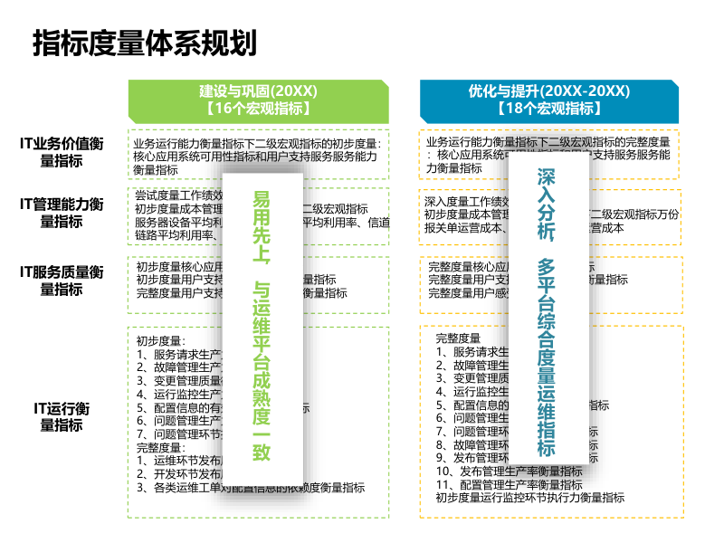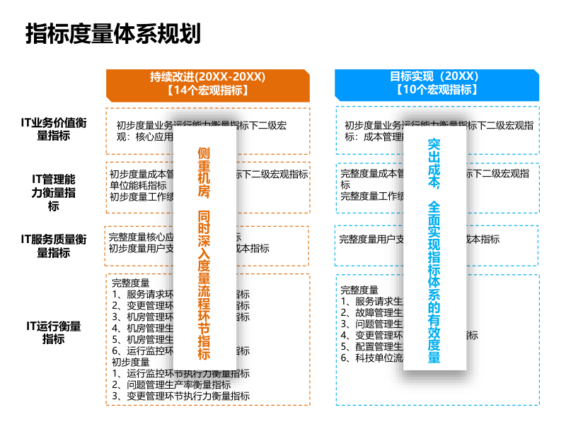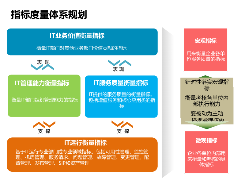 初期聚焦运行监控与服务质量;中期深化流程执行度量;长期实现成本与绩效全面分析。