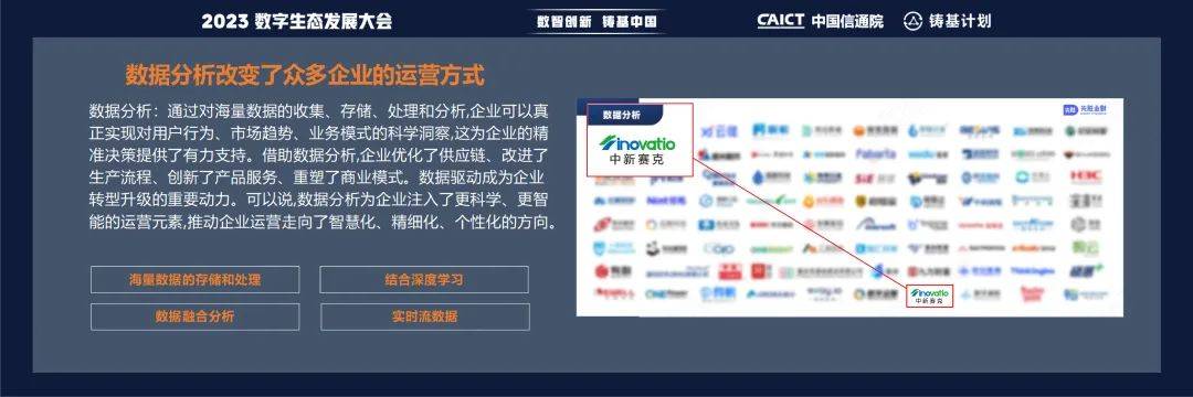 本次大会发布了中国信通院《高质量数字化转型产品及服务全景图(2023)》,中新赛克海睿思受邀出席本次大会并成功入选全景图中的高质量数字化转型数据分析板块,成为数据分析细分领域高质量代表企业之一。