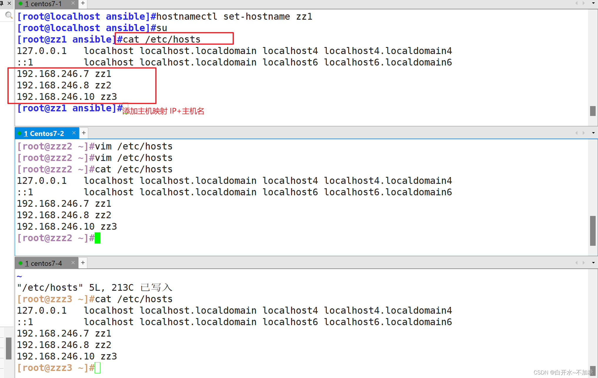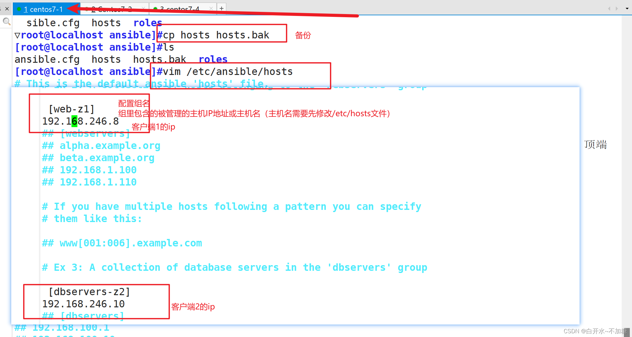 - /etc/ansible/hosts 主机清单 (放了被管理的主机 修改的)