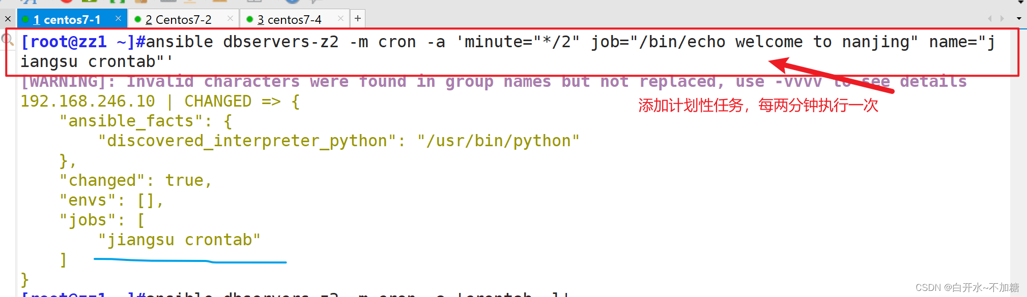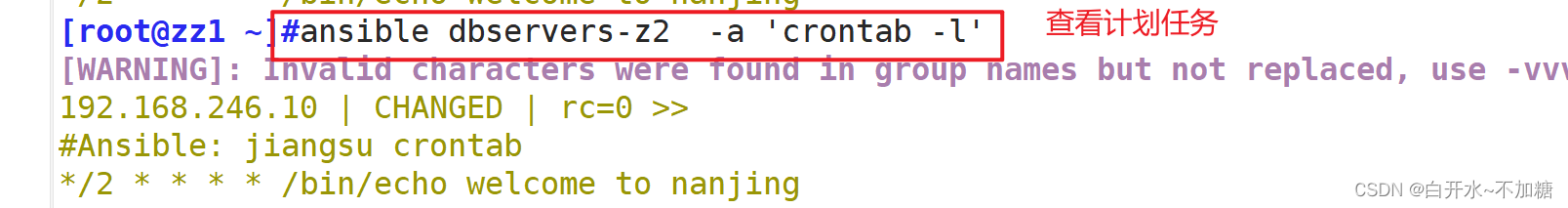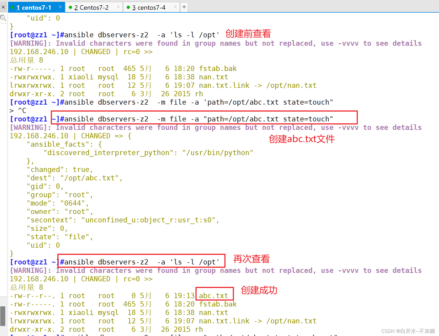 ansible dbservers-z2 -a 'cat /opt/nan.txt' 查看内容
