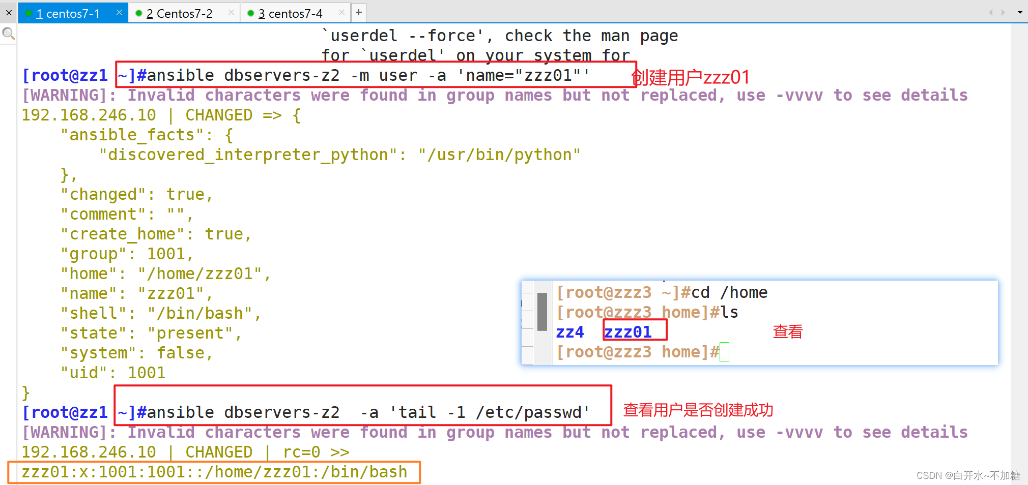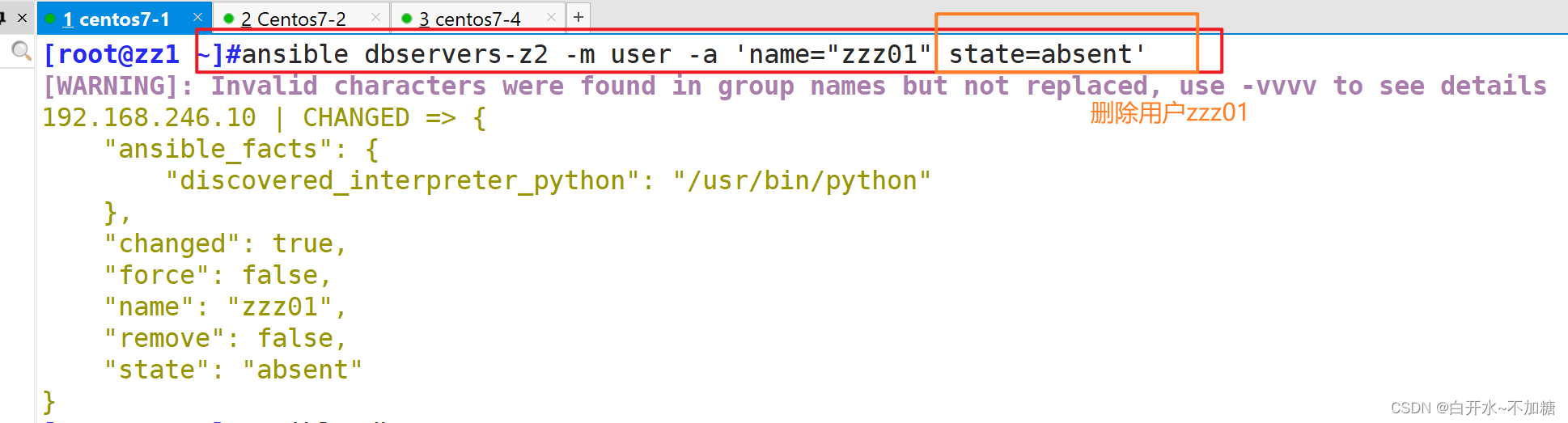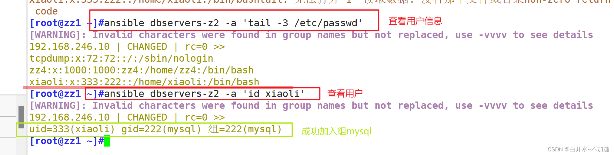 ansible dbservers -m user -a 'name=test01 uid=306 system=yes group=mysql' #将test01用户添加到mysql组中