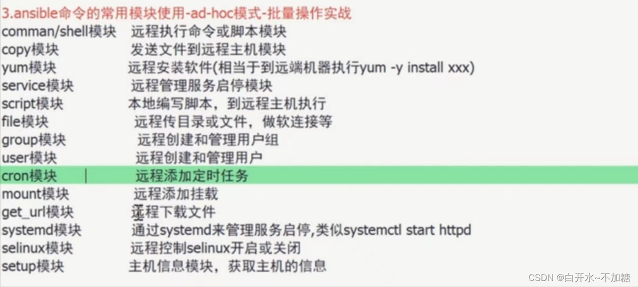 Ansible是基于模块工作的,它只是提供了一种运行框架,它本身没有完成任务的能力,真正执行操作的是Ansible的模块, 比如copy模块用于拷贝文件到远程主机上,service模块用于管理服务的启动、停止、重启等。