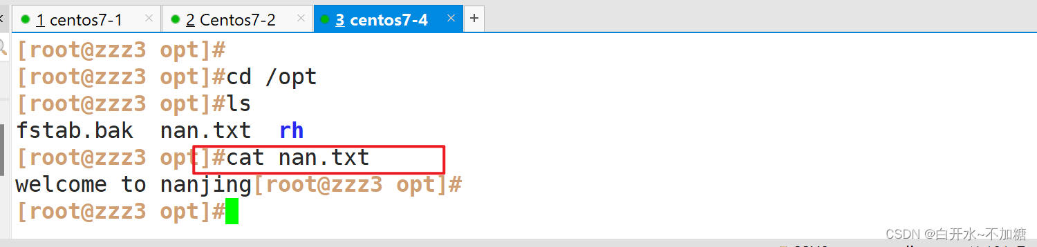 #将welcome to nanjing写入/opt/nan.txt文件中